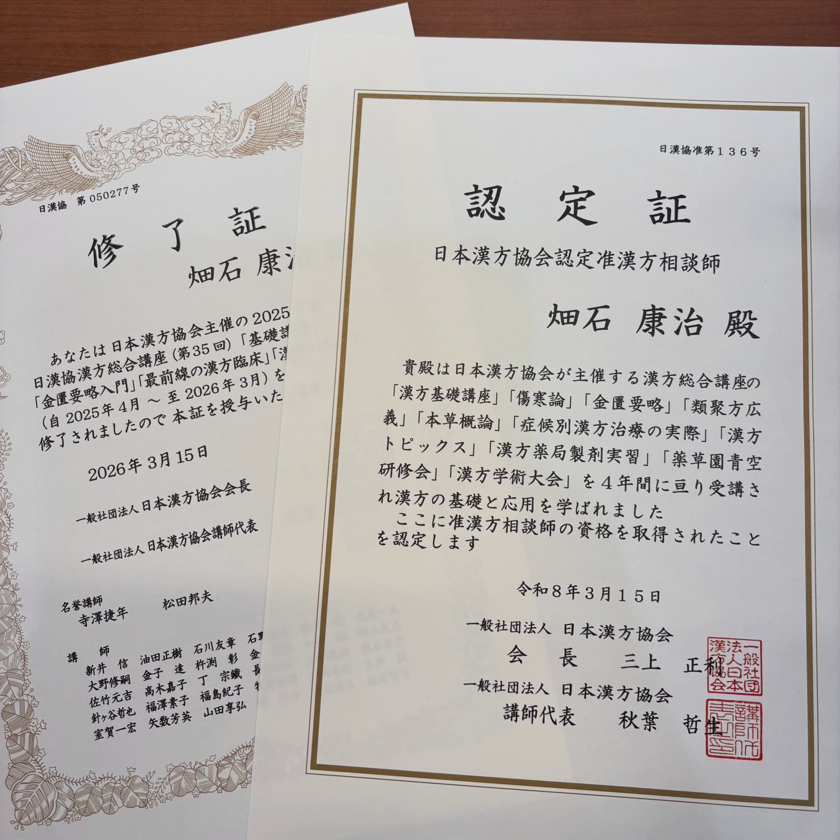 日本漢方協会認定准漢方相談師の資格を取得しました。